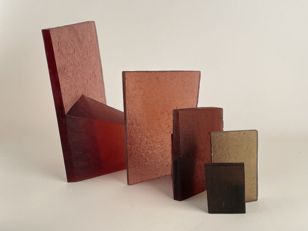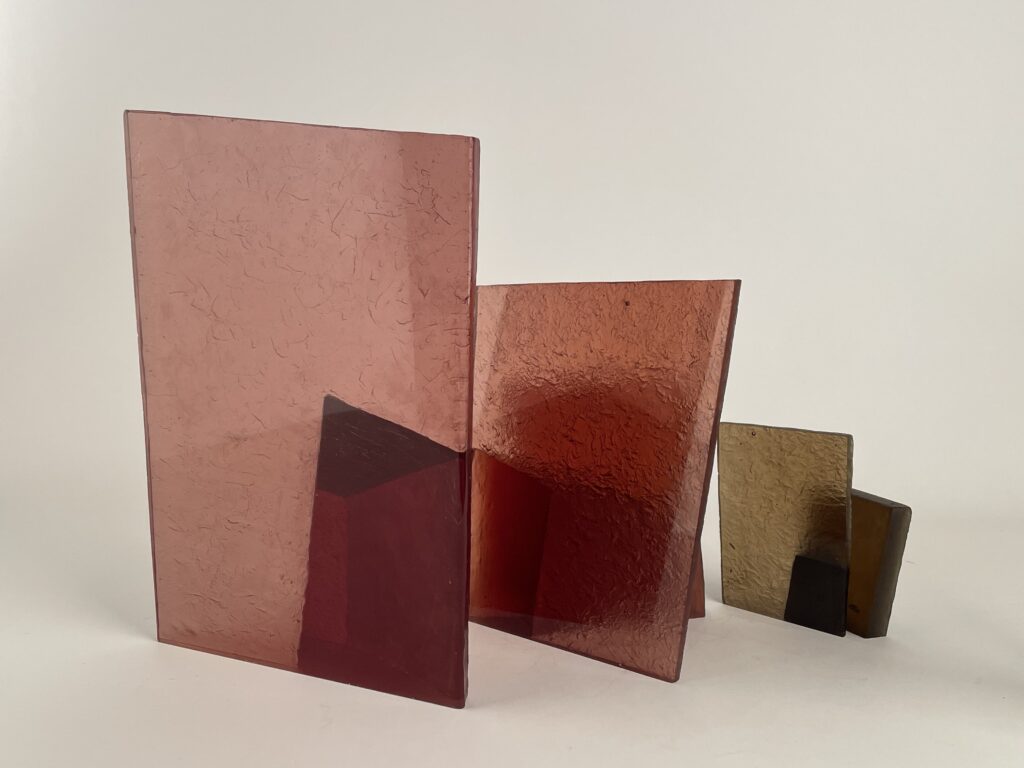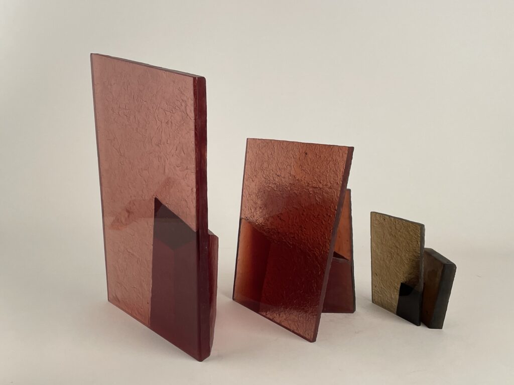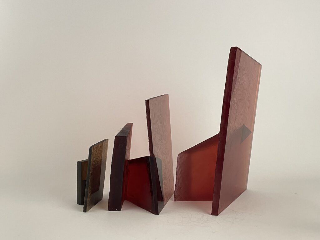 Cast in transparent glass, the overlapping forms allow partial visibility while resisting full access. The material’s clarity emphasizes depth and spatial recession, while its solidity maintains a sense of containment. As the viewer moves around the work, perception shifts continuously, revealing changing alignments and interruptions between interior and exterior spaces.